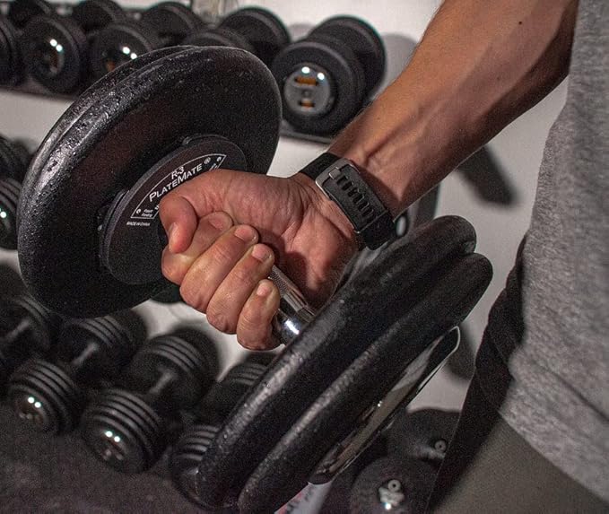 - TWO DUMBELLS: 5 lb Set (1.25 lb each) Easily add The PlateMate R-3's to any type of dumbbell. (PATENTED)