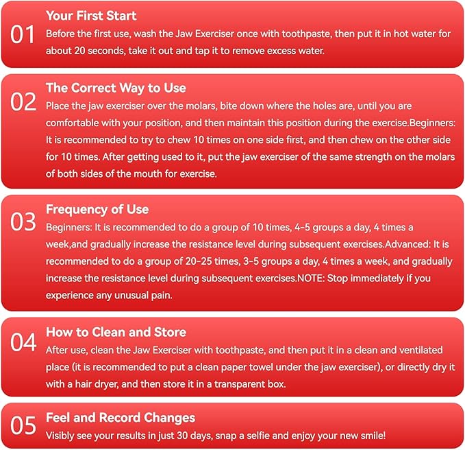 - Training Method: Take out a suitable jaw trainer and clean it with water before use. Chew it between your teeth. Exercise for 10-15 minutes each time, and you can exercise multiple times.