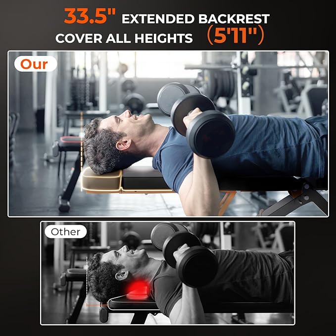 - 【Cover All Heights(5’11’’)】With the addition of a two-stage adjustable headrest design, the backrest length of the foldable weight bench reaches 33.5 inches, accommodating users of varying heights(5’11’’) and effectively protecting your neck and spine. The 12.4" wide backrest provides strong support for the back and waist of people with different body types, making your bench press exercises more comfortable and efficient.