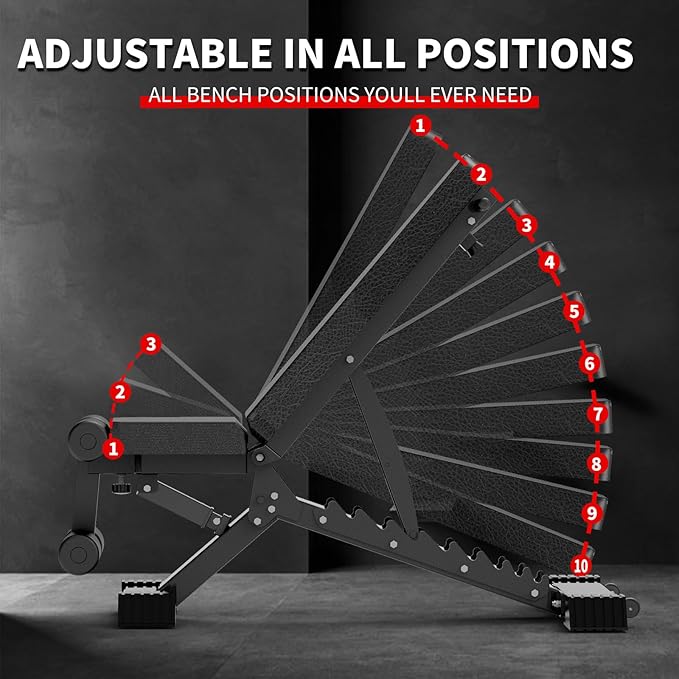 - ✅【ADJUSTABLE INCLINE】10 backrest positions and 3 seat positions bring versatility with incline, flat and decline adjustments. It allows for a range of abdominal, arm, shoulder back and chest in exercises compact design.
