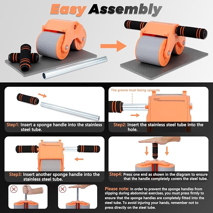- đȘăHigh-Quality Ab Roller WheelăThe automatic rebound abdominal wheel is made of stainless steel, plastic and sponge.The triangular structure design and thickened steel tube provide a weight capacity of up to 440 pounds, meeting the needs of most fitness enthusiasts;The two wheels are made of tire-like material, ensuring no noise or floor scratches.The thickened sponge handles are sweat-absorbent, non-slip,and provide a more comfortable abs exercise experience.
