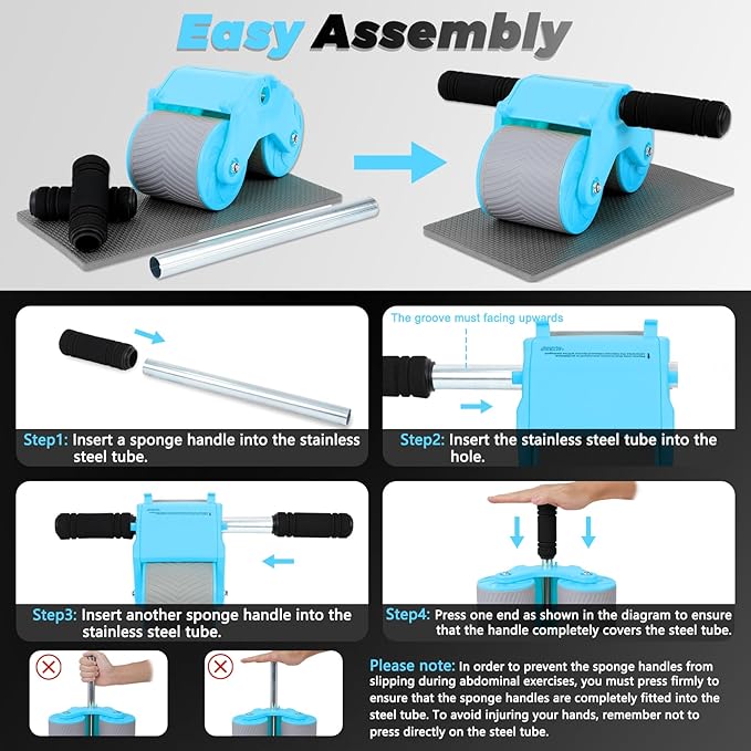 - đȘăHigh-Quality Ab Roller WheelăThe automatic rebound abdominal wheel is made of stainless steel, plastic and sponge.The triangular structure design and thickened steel tube provide a weight capacity of up to 440 pounds, meeting the needs of most fitness enthusiasts;The two wheels are made of tire-like material, ensuring no noise or floor scratches.The thickened sponge handles are sweat-absorbent, non-slip,and provide a more comfortable abs exercise experience.