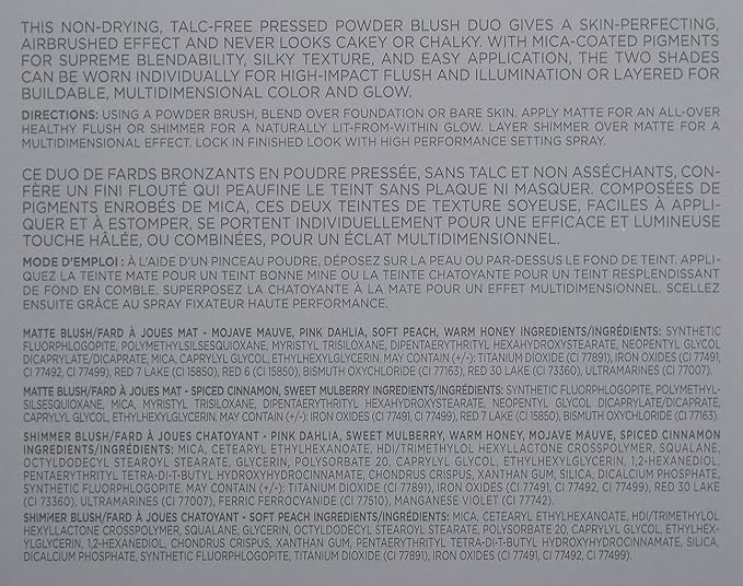 - INCLUDES MATTE & SHIMMER FINISHES: Here's something to blush about. This blush compact includes two coordinating monochrome shades, one shimmer and one matte, for creating endless looks. Use one for your desired finish or layer them for multidimensional radiance.