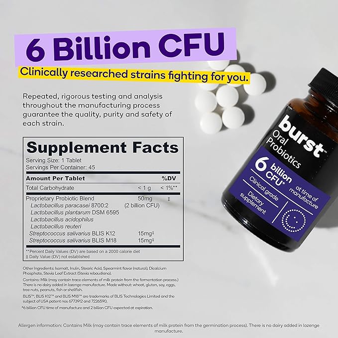 - EXPERT RECOMMENDED PROBIOTIC BLEND: Powerful and targeted, our unique & potent blend contains the highest concentrations of BLIS K12 & BLIS M-18 available on the market at 6 billion CFU**. K12 & M18 help establish and maintain a healthy bacterial balance in the mouth.