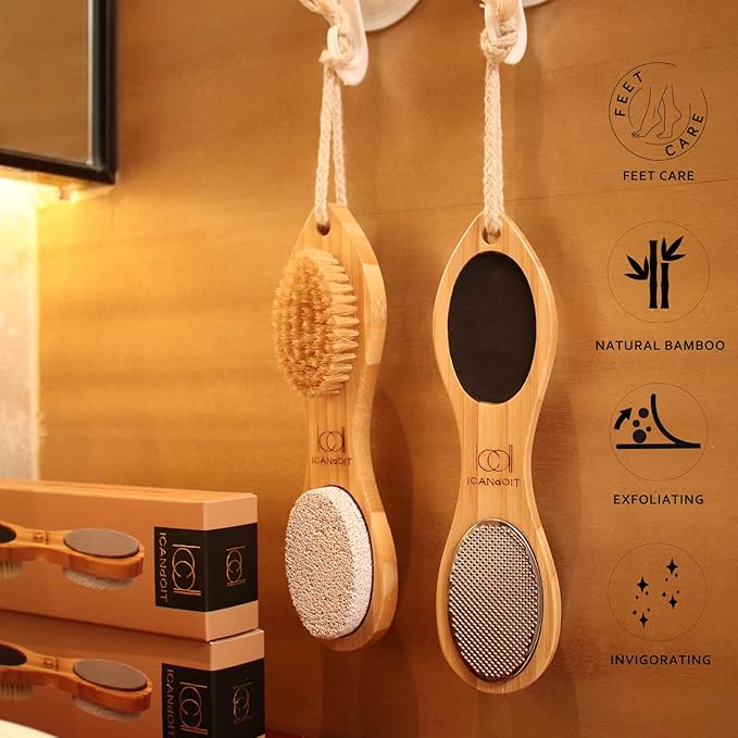 ICDI ICANdOIT Natural Bamboo Foot File Callus Remover-Multi Purpose 4 in 1 Feet Pedicure Kit with Foot Care Boar Bristle Brush,Pumice Stone,Foot Rasp,Sand Paper