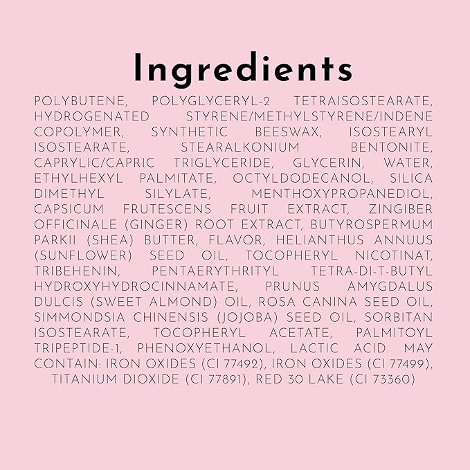 - Key Active Ingredients: Formulated with MAXI-LIP, a natural peptide complex that stimulates collagen synthesis via Hyaluronic Acid. Our gloss deeply moisturizes and firms the lips, making them appear bigger, smoother, and more defined. Enriched with Shea Butter to hydrate and soothe the lips, and Rosehip Oil to make them pillowy soft.