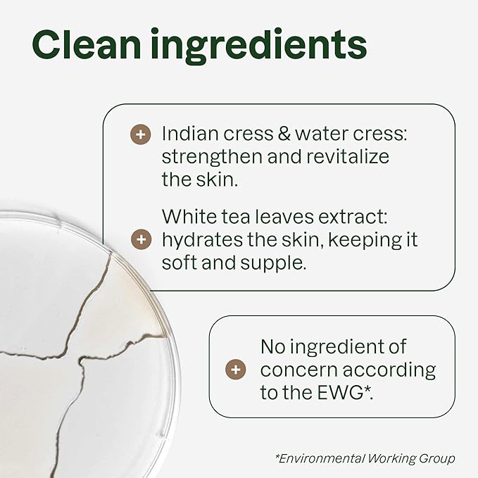 - NATURALLY SOURCED INGREDIENTS: Made with 98.8% naturally sourced ingredients* including white tea leaf extract that revitalizes, hydrates, and protects the skin, leaving it feeling soft and smooth, as well as watercress and Indian cress extracts known to revitalize dry skin and restore the skin’s suppleness *According to ISO 16128 standards