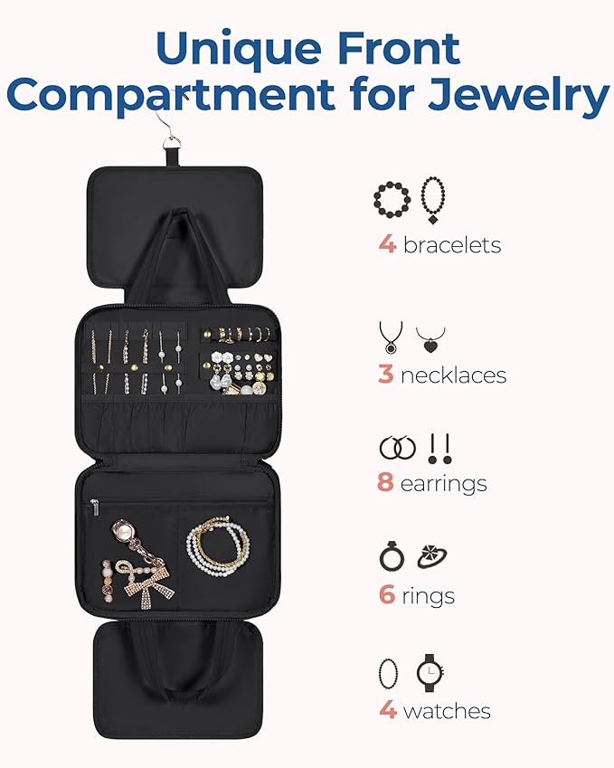 - ๐๐๐ฐ๐๐ฅ๐ซ๐ฒ ๐๐จ๐ฆ๐ฉ๐๐ซ๐ญ๐ฆ๐๐ง๐ญ: Bagsamrt toiletry bag is design with jewelry organizer compartment. Adding a compartment in the front pocket of travel bag for rings, ear rings, bracelets, bangles, necklaces, and other jewelries, meeting your travel toiletries and makeup needs