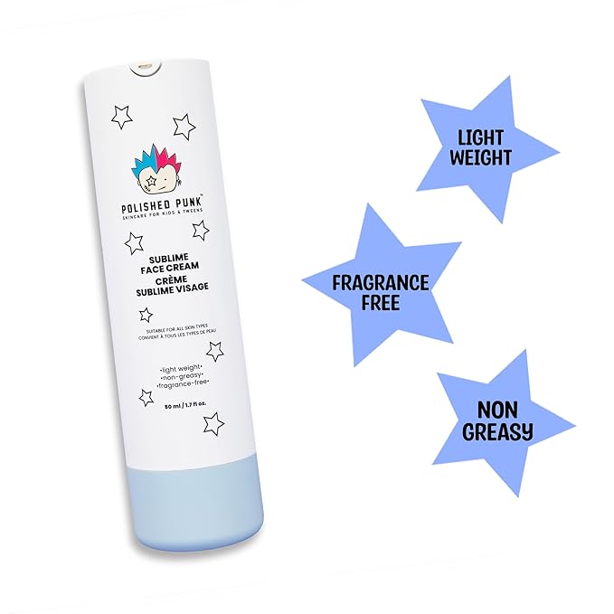 - Gentle Skincare for Young Faces: Polished Punk facial skin care products is fragrance-free, lightweight, and non-greasy absorbs quickly, leaving the skin feeling soft and refreshed. This moisturizing face cream is enriched with aloe vera, offering hydration for dry skin and providing a gentle touch on skin. From school days to outdoor playtime, our nourishing face moisturizing cream provides daily protection, helping shield young skin from environmental stressors. It's an essential part of any child's skin care routine.
