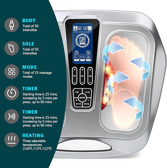 - Smart, Safe & User-Friendly Design:Enjoy peace of mind with built-in safety features including a 30-minute auto-shutoff to prevent overuse and noise-free operation. The one-size-fits-all design accommodates any foot size comfortably.