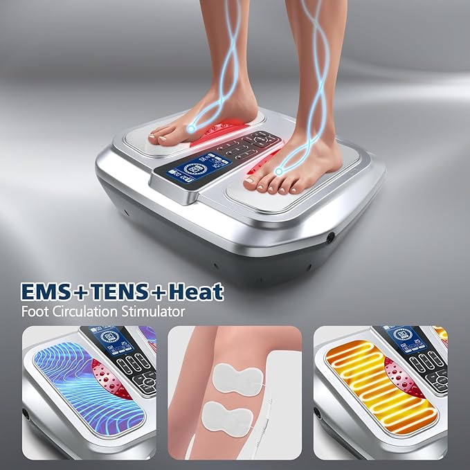 EMS Foot Massager with Heat,TENS Electronic Muscle Circulation Stimulator with 4 Electrode Pads for Neuropathy,Relieves Swelling, Fatigue, Plantar Fasciitis-Silent Operation (Silver) (Silver)