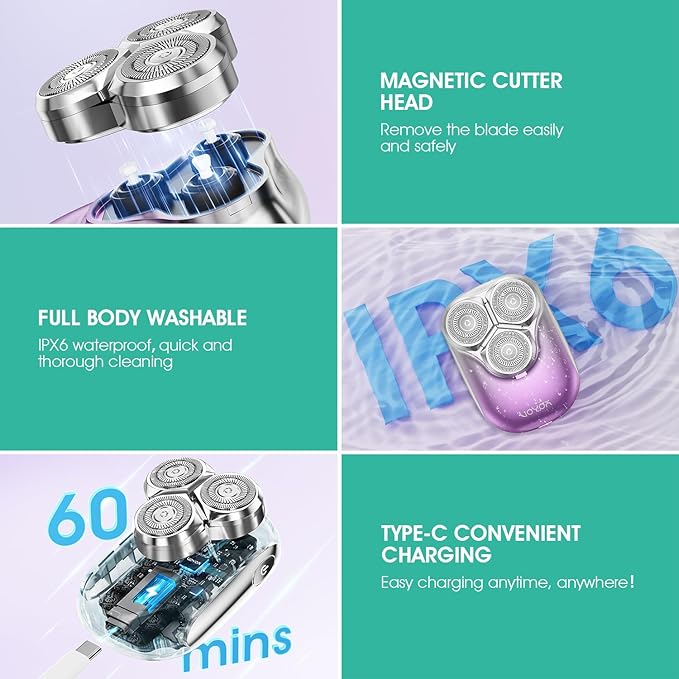 - Waterproof & Easy To Operate: Electric razor for women is IPX6 waterproof all over, can be used wet or dry! Magnetic head, easy to remove, can be rinsed directly under the running water, easy to clean. One-button operation is easy for both novice and experienced shavers!