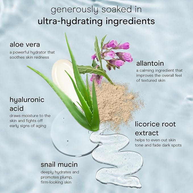 - Soak Up The Glow: This hydration face mask is our take on the Korean sheet mask - but even better! Our face mask sheet is soaked in snail mucin, hyaluronic acid, and aloe vera, wrapping your skin in a moisture blanket for a dewy, luminous glow.