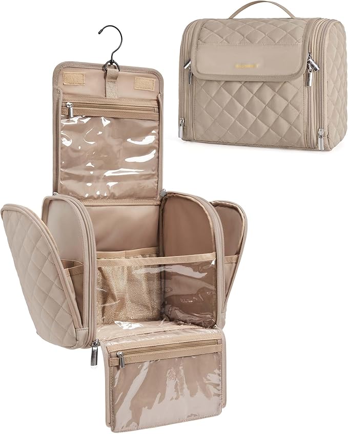 BAGSMART Makeup Bag for Women with Hanging Hook, Large Portable Capacity Water-resistant Organizer Travel Case for Toiletries and Cosmetics, Brown