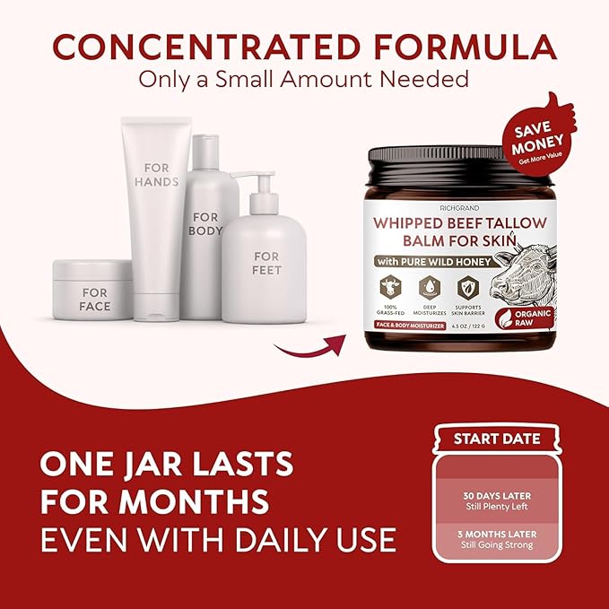- Pack of 4 pcs: Made with 100% grass-fed beef tallow, this whipped balm deeply hydrates, boosts elasticity, and reduces fine lines for a radiant, youthful glow