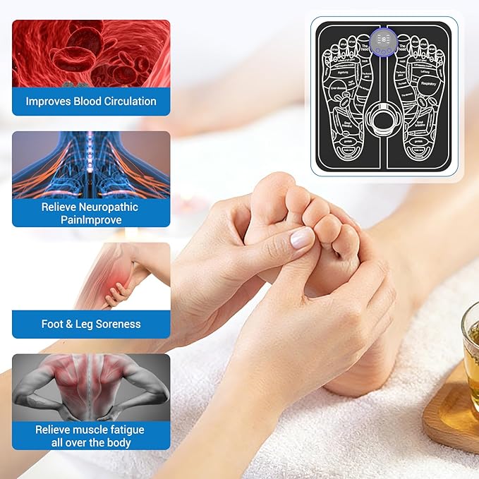 - User-Friendly Design with Full-Body Support Includes 4 body electrode pads + 2 sole pads for feet stimulation. LCD screen displays mode, intensity, and timer (25-min auto shutoff). Lightweight (1.9kg) and portable.