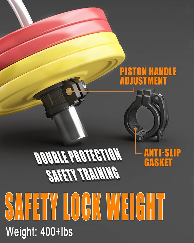 - KEEP WEIGHT: Olympic barbell clamps Piston handle, say goodbye to single size, turn the handle to adjust the size, Suitable for all 2" / 50mm Olympic bars and 1.9" Specialty Bars, Gym Clips equipped with TPR inserts, with anti-slip texture inside, Double protection bursts out a strong grip, load-bearing 400lb+, non-slip, safety lock weight.
