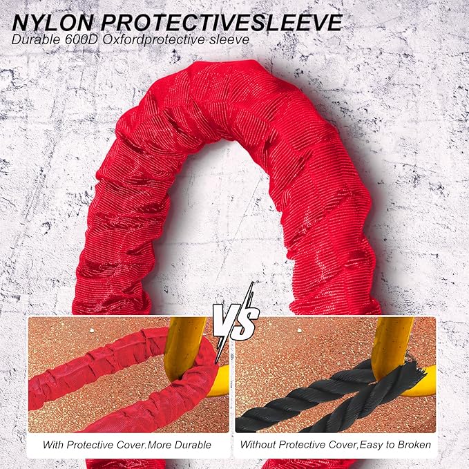 - Battle Rope with Durable Polyester Filament Material: An extra protective cover is added to the outer layer, the battle rope is an ideal choice for beginners and serious fitness enthusiasts for home gym and outdoor exercise. The comfortable coated handle protects your hands and provides a firm grip for all your training and exercises. High tensile strength exercise rope prevents breaking, abrasion, or loosening