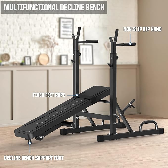 - 【ALL-IN-ONE】 Get the multifunctional BEKING workout bench,What you get is not only a weight bench, but also a barbell rack, a dip station, and push up machine.Contributes to a variety of workouts such as bench press, push-ups,sit-ups,dumbbell bench,dip station and more. Ideal for personal training and even a home gym.