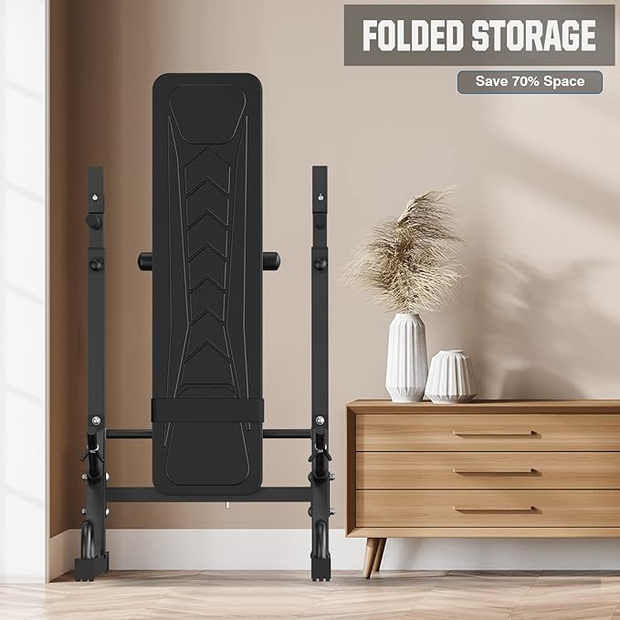 - 【SPACE SAVING TO STORE】 The Olympic weight bench with babrbell rack can be folded up quickly ,ultra compact and easy to stow away.You can lean it against the wall to save space,and the thickened steel stand makes it free to stand and not easy to fall.