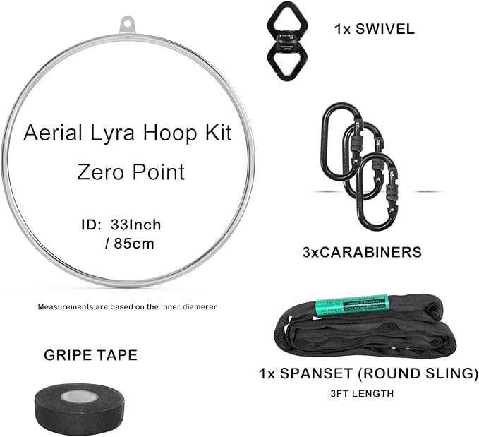 - This is a complete aerial hoop setup. Ready to hang and start performing. It comes with a lyra/aerial ring, attachment carabiners, a swivel, and 3-foot long spanset. load tested to 300kg.