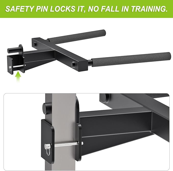 - 【Safety and Stability】The Y-Shaped Dip Bar have a locking clasp that secures them firmly to the power cage and prevents them from slipping off during your workout. You can exercise with confidence and peace of mind.