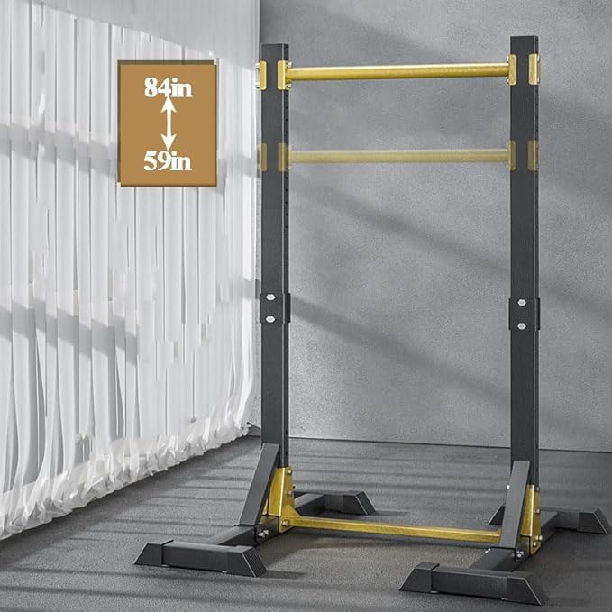 - 11 adjustable height: The power tower has 11 gears adjustable height from 59" to 84",which can be adjustable freely.The hole space of pull up stand is 2.4 inches, adults and children can be used.