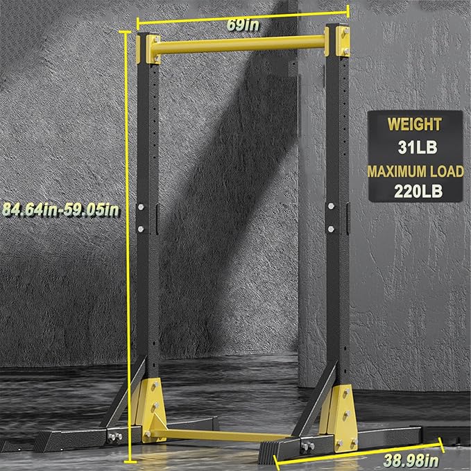 - SIZE: 69 inches(L)x38.98 inches(W)x 84.64 inches(H); Weight: 31 lb, with a maximum capacity of 220 pounds. The pull-up bar has 11 adjustable positions, suitable for adults and teenagers