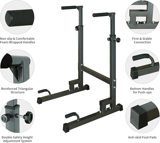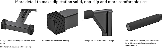 - 【Solid Dip Station】Made of high quality steel with a double black powder-coated finished, T-shaped base with a large force area and triangle welded reinforcement design, durable use. The T-shaped base has rubber feet ends, non-slip and more stability, can support to 800lbs.